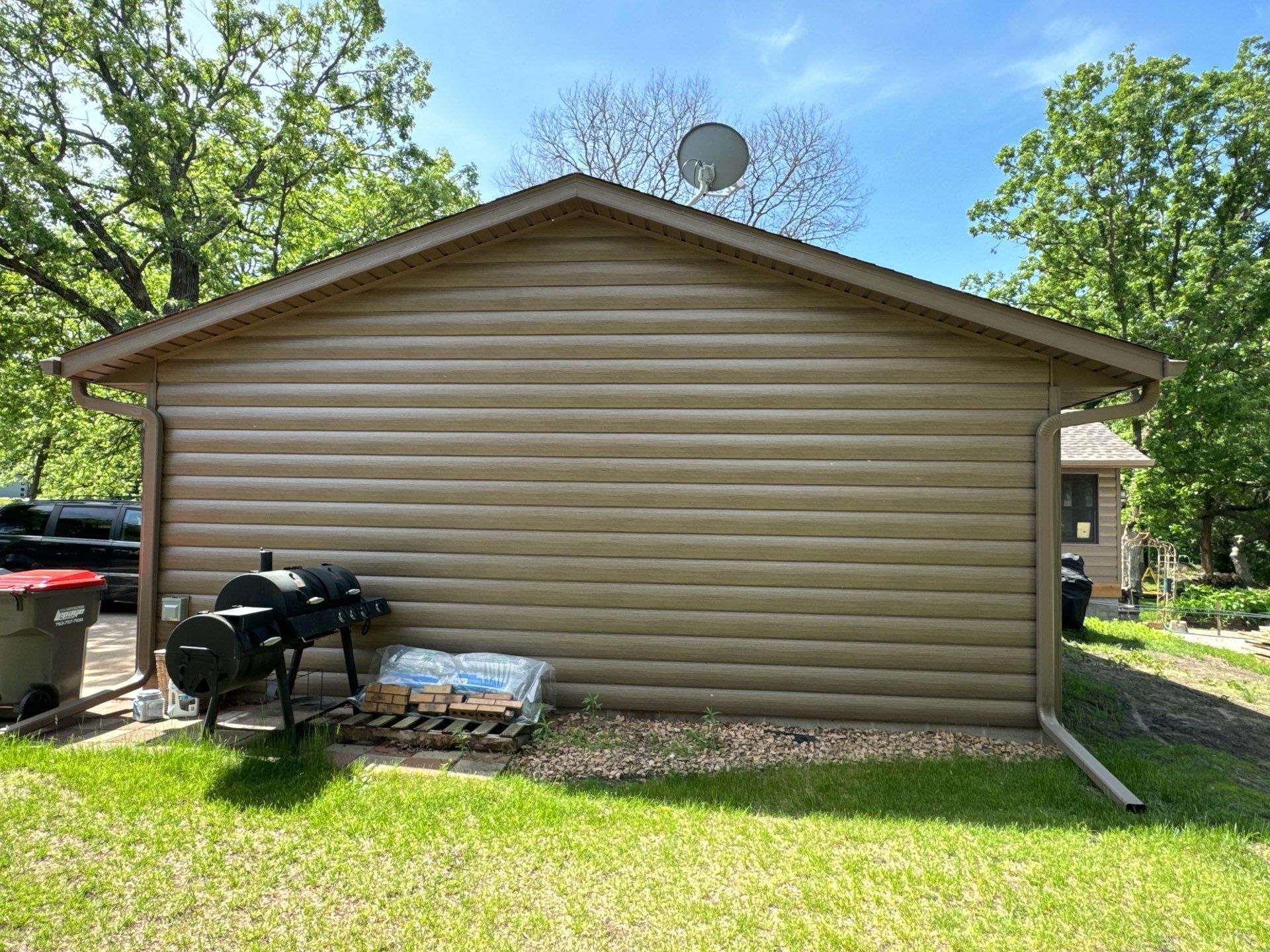 We were up in Cedar MN installing ABC Seamless Steel Log Siding this week. The look of logs without the cost of maintenance and upkeep! The color is High Definition Canyon. A blended color that shows of real wood. Note the board & batten on the front of the home – works well with the log siding!