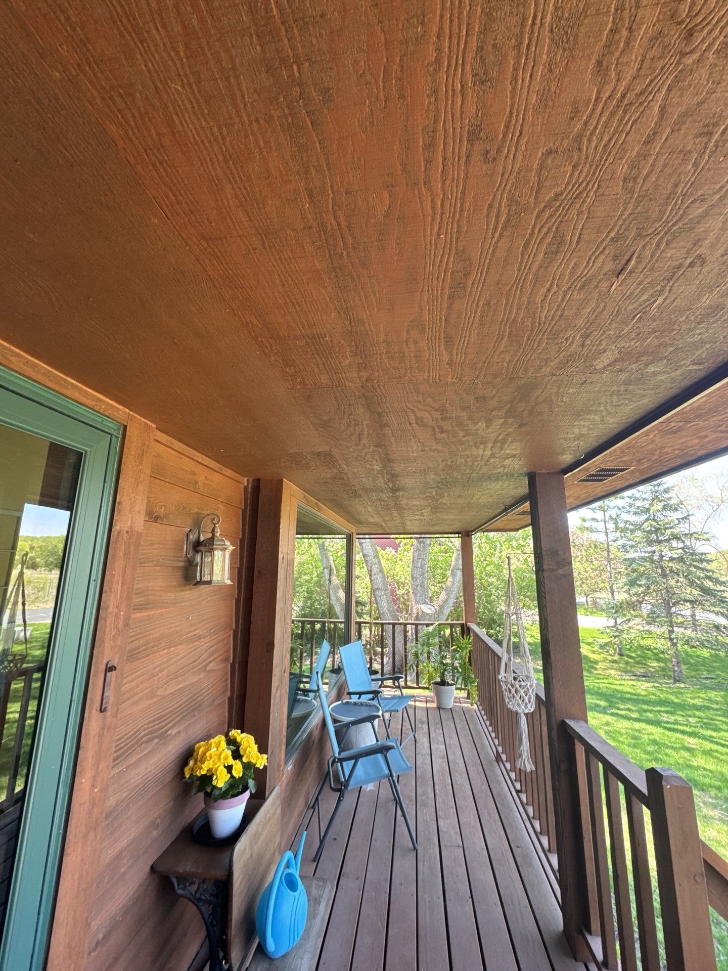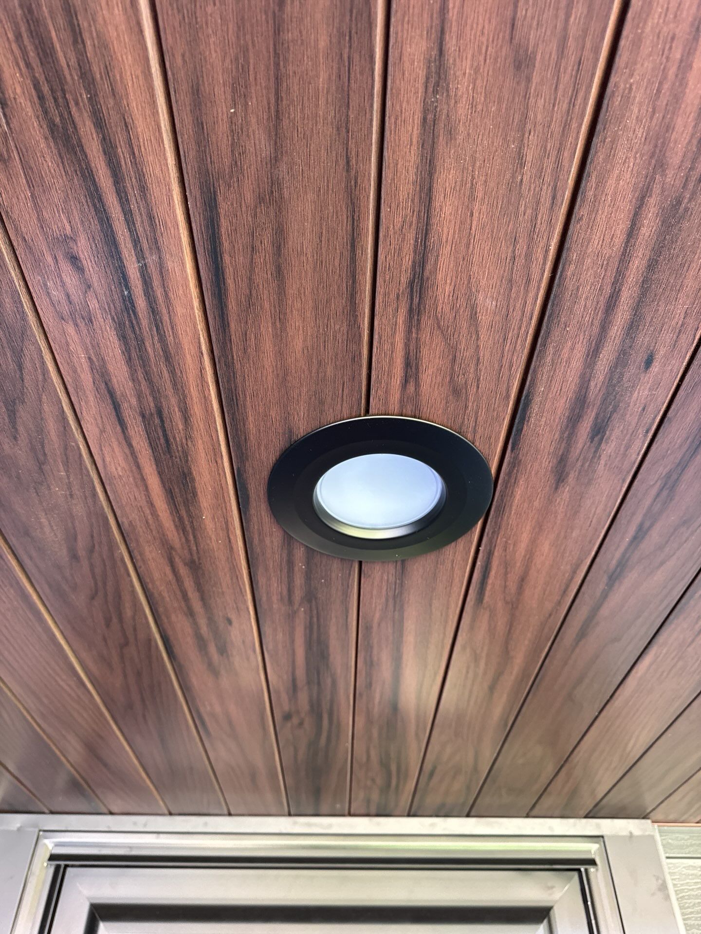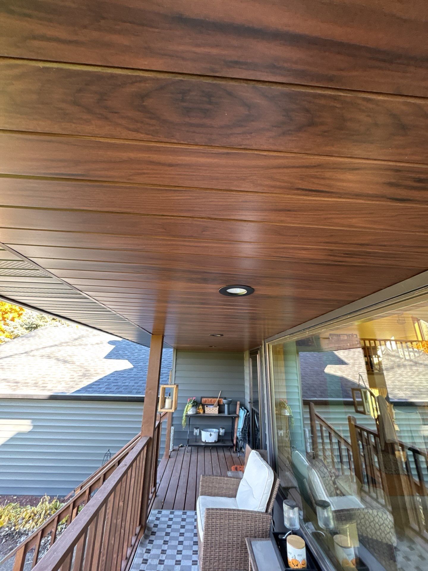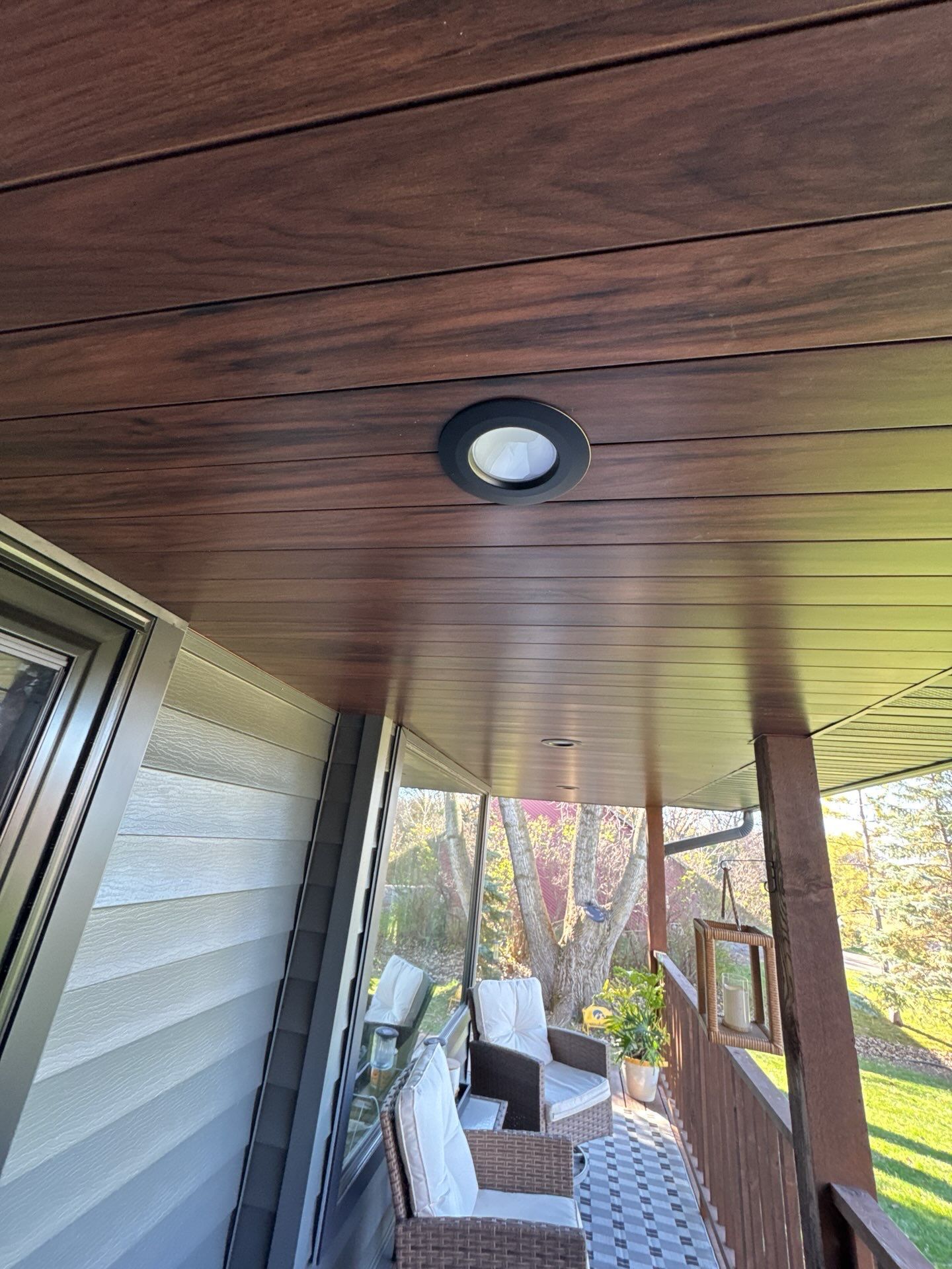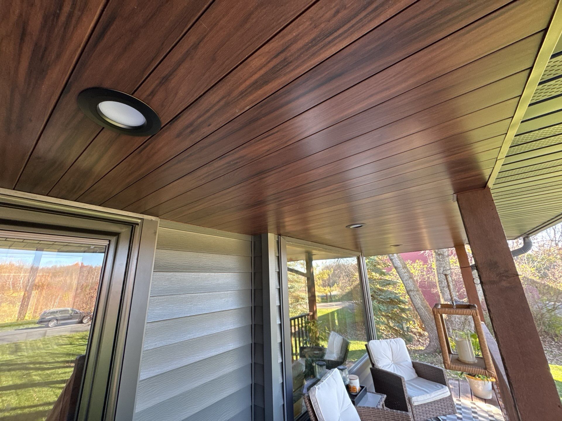for the ceiling. It looks just like real wood and really adds to the porch’s comfortable atmosphere. We even installed in-ceiling lighting!