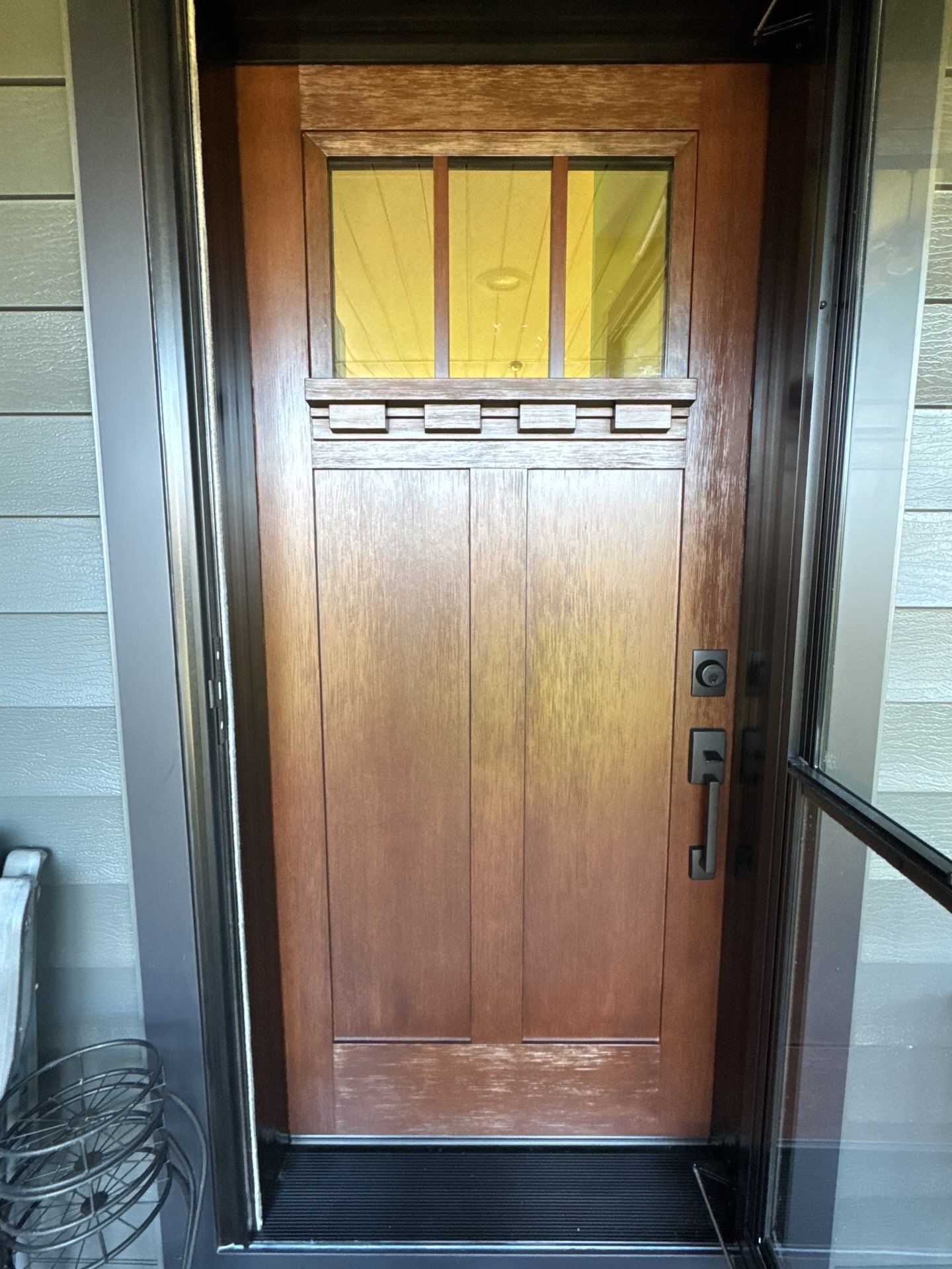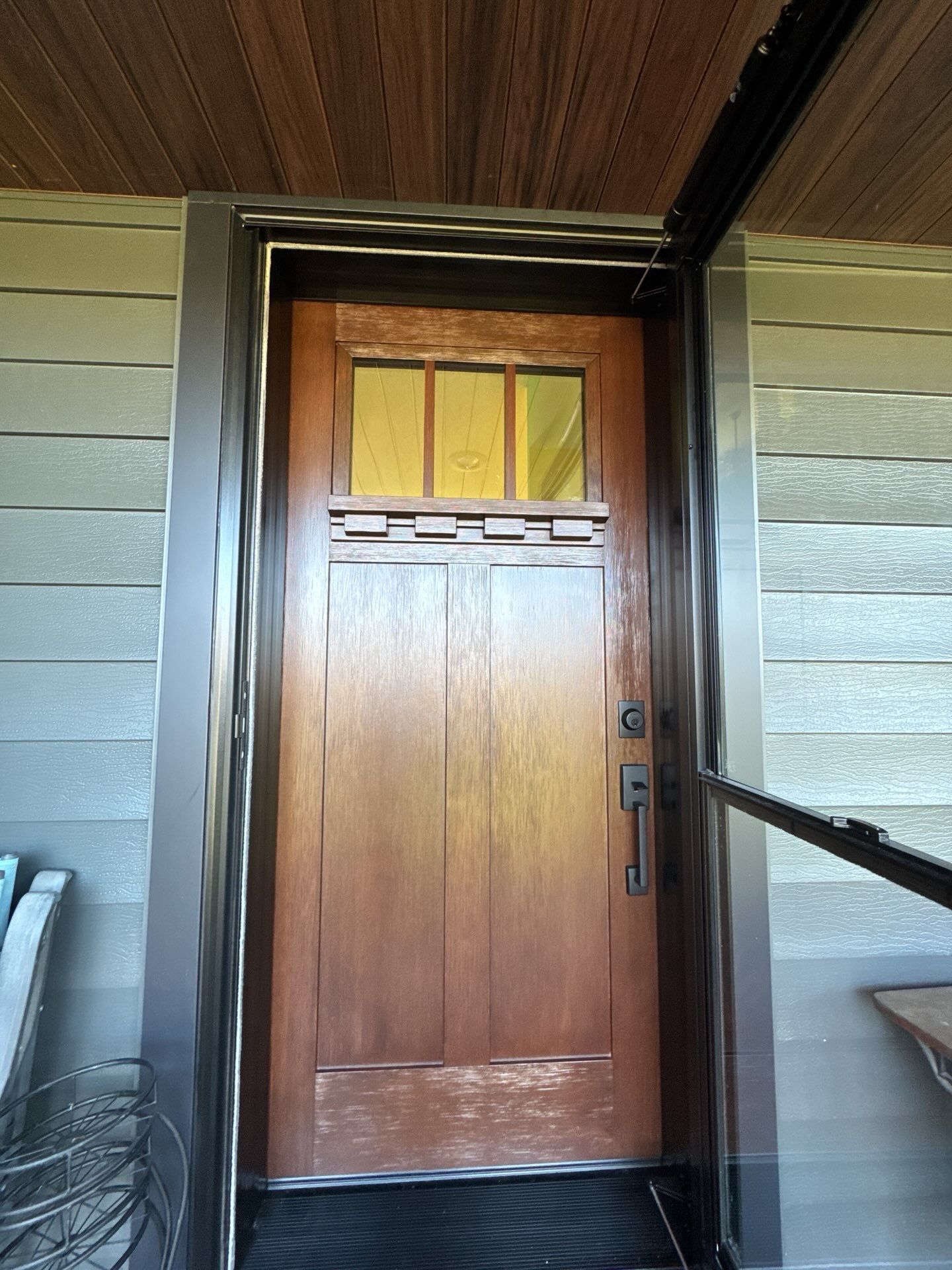 1 new ProVia® Signet® Fir fiberglass entry door in Truffle and 1 ProVia® Spectrum™ storm door in Coal Black to match the trim