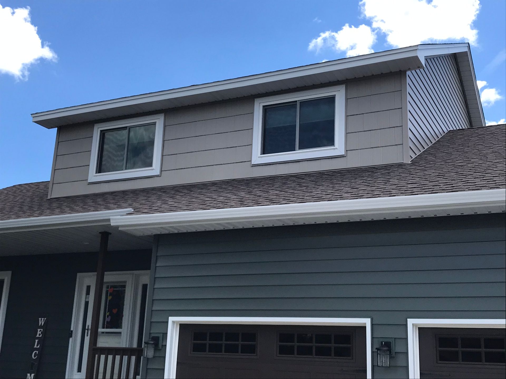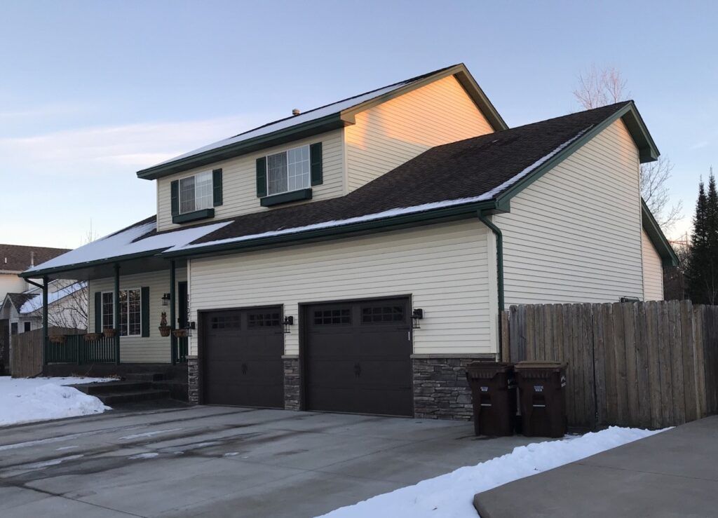 Recent project from ABC Seamless Siding & Gutters. Included is our 6″ Willow and Sandtone seamless siding. Glacier white soffit-fascia, trims, and our ABC Seamless Designer Gutter System. Also included is steel shakes in Sandtone – one of many great accessory products available from ABC Seamless.